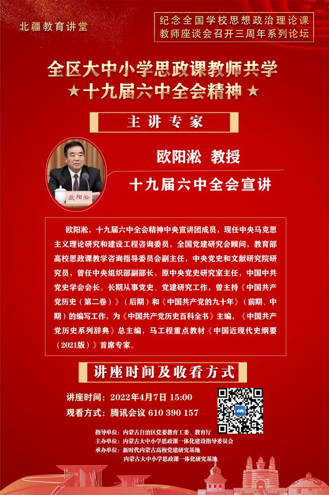 本次講座自治區(qū)教育廳邀請了黨的十九屆六中全會(huì)精神中央宣講團(tuán)成員、中央馬克思主義理論研究和建設(shè)工程咨詢委員、全國黨建研究會(huì)顧問、教育部高校思政課教學(xué)咨詢指導(dǎo)委員會(huì)副主任、中央黨史和文獻(xiàn)研究院研究員歐陽淞作專題講座。講座緊緊圍繞學(xué)習(xí)領(lǐng)會(huì)習(xí)近平總書記在十九屆六中全會(huì)上的重要講話和《決議》精神,從深刻把握召開黨的十九屆六中全會(huì)、作出新的歷史《決議》的重大意義;深刻把握黨的百年奮斗的初心使命和重大成就;深刻把握中國特色社會(huì)主義新時(shí)代的歷史性成就和歷史性變革;深刻把握黨的百年奮斗的歷史意義和歷史經(jīng)驗(yàn)、走好新的趕考之路等方面,運(yùn)用豐富史料與詳實(shí)數(shù)據(jù),進(jìn)行了系統(tǒng)闡述和深入解讀。