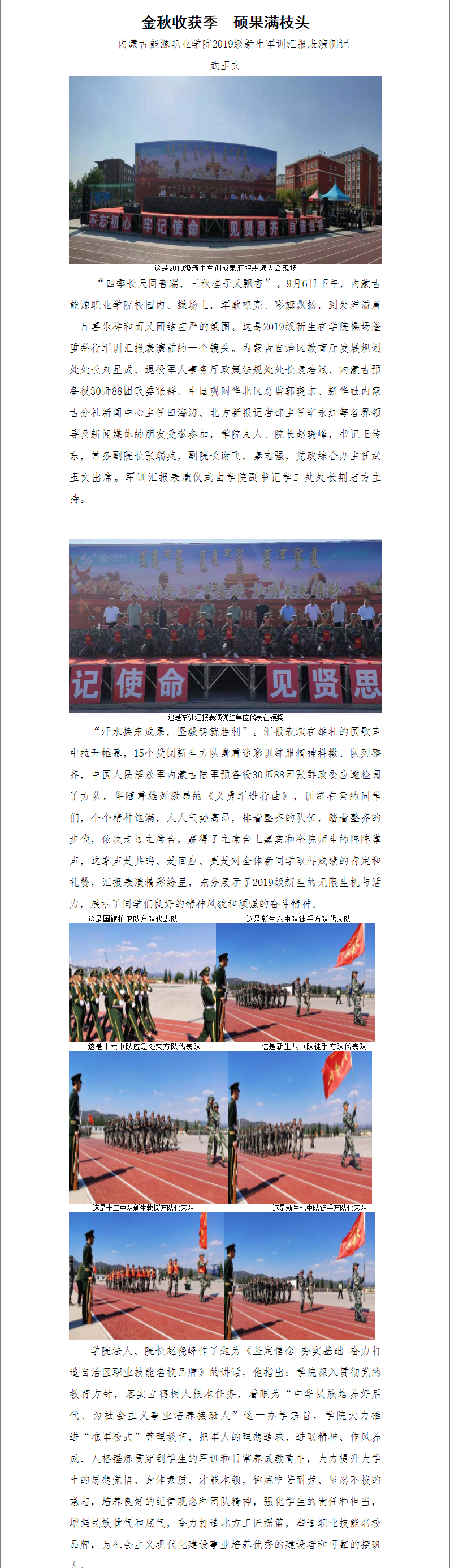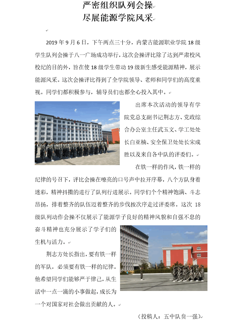 金秋時(shí)節(jié),丹桂飄香。攜著第一縷朝陽(yáng),內(nèi)蒙古能源職業(yè)學(xué)院全院師生迎來了第一次升旗儀式。據(jù)悉,每周一的清晨,學(xué)院各單位隊(duì)列整齊秩序井然走向國(guó)旗臺(tái)升旗位置。升國(guó)旗活動(dòng)是學(xué)院對(duì)學(xué)生進(jìn)行愛國(guó)思想政治教育的一項(xiàng)重要活動(dòng)。長(zhǎng)期以來,我院堅(jiān)持弘揚(yáng)和踐行社會(huì)主義核心價(jià)值觀教育,始終把國(guó)旗班作為載體不斷推進(jìn)愛國(guó)主義教育實(shí)踐。從成立至今,學(xué)院國(guó)旗班以青春和熱血捍衛(wèi)著國(guó)旗尊嚴(yán),以責(zé)任和堅(jiān)守成為了能源學(xué)院一道亮麗的風(fēng)景線...