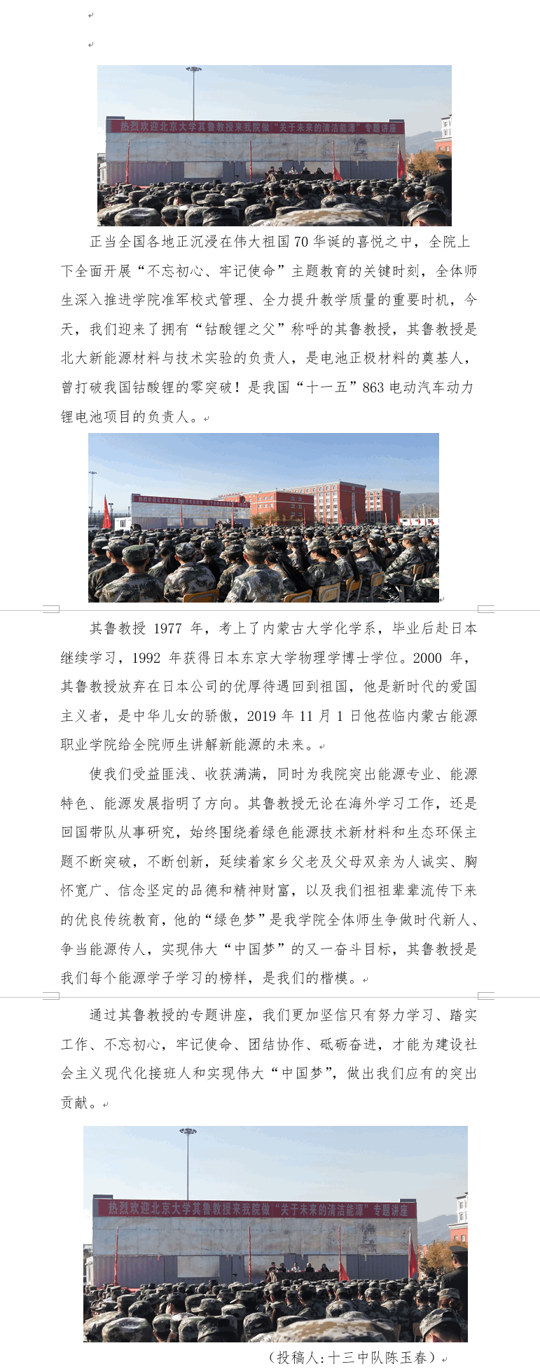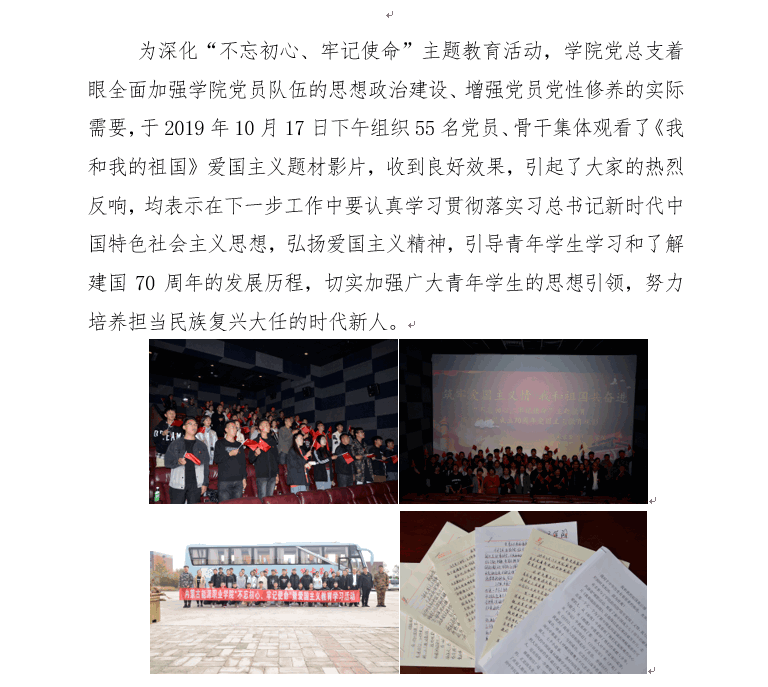 開展“不忘初心、牢記使命”主題教育,是新時代堅持和加強(qiáng)黨的全面領(lǐng)導(dǎo)、全面從嚴(yán)治黨、推進(jìn)新的偉大工程的內(nèi)在要求。根據(jù)上級黨委部署及團(tuán)市委要求,現(xiàn)制定我院“不忘初心,牢記使命”主題教育活動方案。學(xué)院將于2019年10月17日下午組織觀看獻(xiàn)禮70周年愛國主義教育影片《我和我的祖國》。一、活動目的:緊緊圍繞立德樹人中心任務(wù),全面加強(qiáng)學(xué)院黨員教師思想政治建設(shè),增強(qiáng)黨員黨性修養(yǎng),辦高質(zhì)量學(xué)校,當(dāng)有責(zé)任心老師...