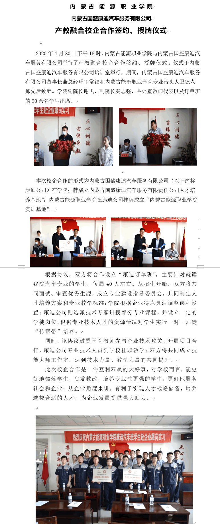 內(nèi)蒙古國(guó)盛康迪汽車服務(wù)有限公司與產(chǎn)教融合校企合作簽約、授牌儀式