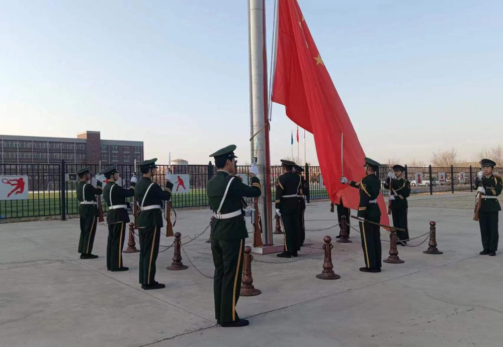 五星紅旗在國旗班的護送下莊嚴(yán)入場,伴著雄壯的義勇軍進行曲,鮮艷的五星紅旗再次冉冉升起,全體師生面向國旗、齊唱國歌,表達(dá)對祖國的無限熱愛和崇高敬意。