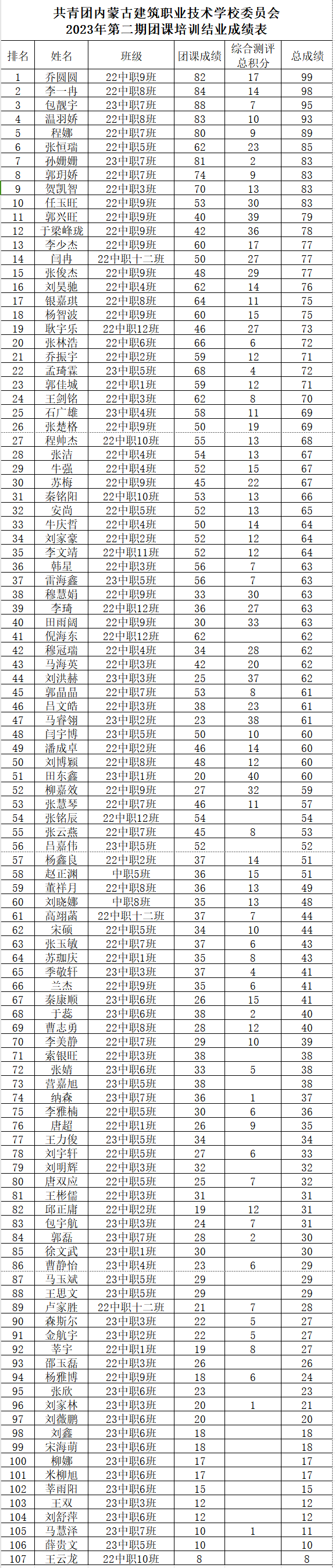 共青團(tuán)內(nèi)蒙古建筑職業(yè)技術(shù)學(xué)校委員會(huì)2023年第二期團(tuán)課培訓(xùn)結(jié)業(yè)成績公示